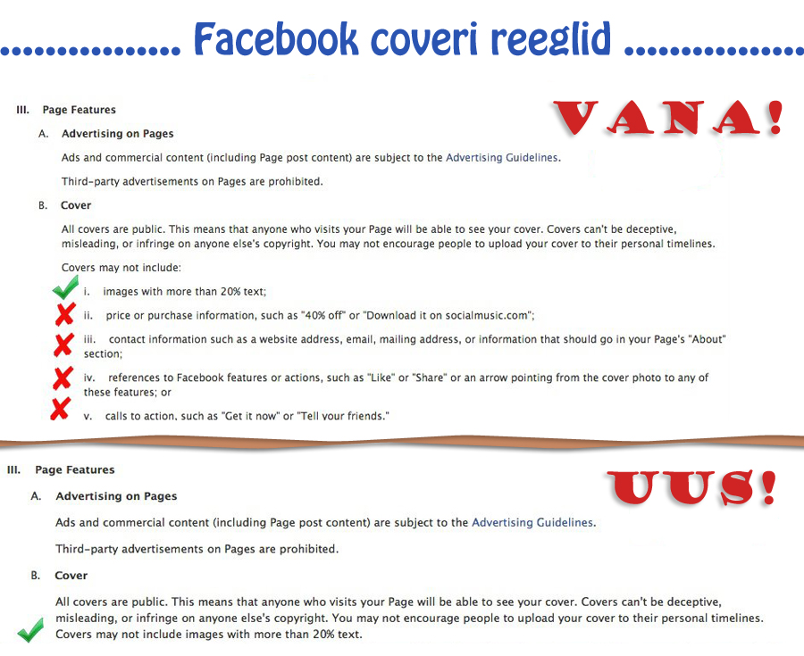 Kõige naljakam selle juures on see, et kui vaatate facebooki juhtnööre, siis on üleval märgata, et neid on viimati muudetud eelmise aasta detsembris. Tegelikult see nii ei ole. Ei tea millest selline arusaamatus, aga las ta olla :). Põhitähtis on see, et enam ei pea muretsema konto kaotuse pärast. Omaette asi on muidugi see, et palju siis on 20% pildist tekst.